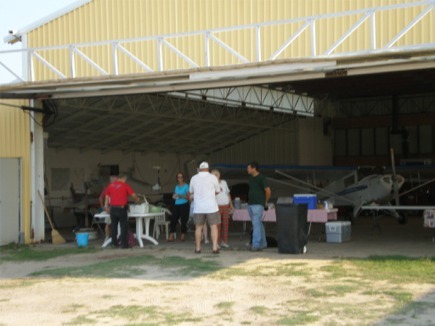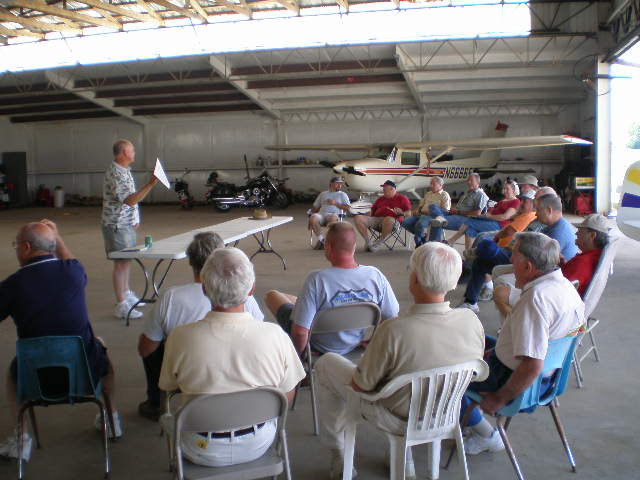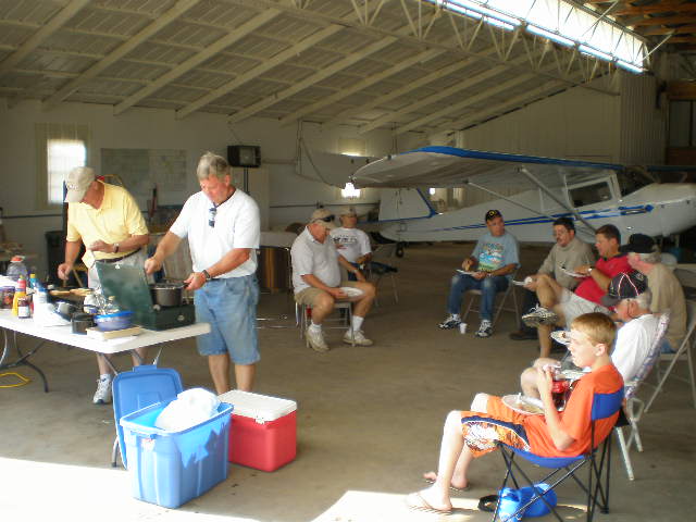 We had a good turnout for our August 24th meeting at Pelion Corporate Airport (6J0). Although the terminal was a bit small for our group, everyone enjoyed the air conditioning and some respite from the gnats. The business meeting began about 3:15pm, in which members participated in lively discussion. We discussed and took a vote on whether to hold future meetings on Saturday or Sunday. Sunday won out, but we decided to hold our next meeting on Sept 28th later in the evening (6:00pm) than previous and to show a movie afterwards. Leon Strock and Don and Diane Schmotzer provided a late afternoon lunch of bratwursts from the money which Larry donated. Don also fried homemade potato chips "on the spot". Other highlights included: welcoming back members Jim Summers, Karl Fields, and Bruce Harrison; welcoming new member Keath Toney; and Xen Motsinger's renewal of his medical certificate. Jim Herpst, Leon, Rodney, and Don flew their planes after the meeting, and a number of members hung around just to watch.