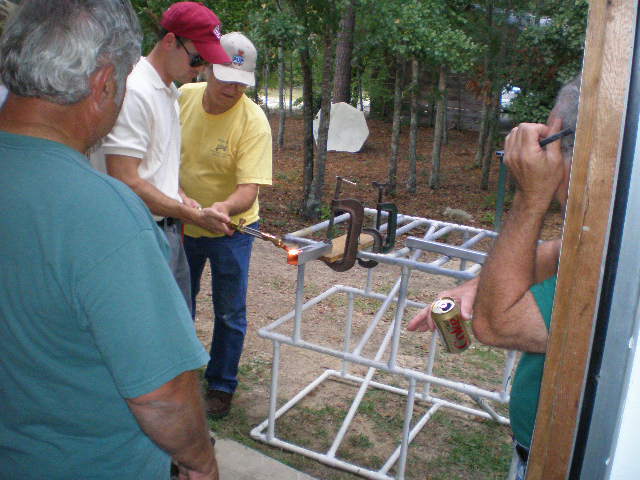 Our September meeting was held at Do Little Field (SC90) on Sunday, September 28th. Everyone had a great time! We wish to thank Norman Davis and his neighbor, Steve Hawley, for holding a very informative welding seminar in which they demonstrated various types of welding, including acetylene, MIG, and TIG. Six members flew in for the event: Don Schmotzer (with Andrew Strock), Leon Strock, Jim Herptz, Ron Johnson, and Randy Berry ... and later, Bruce Harrison (who brought the food). Several members drove or rode in (Ron L., Tony, Keath, and Larry). Afterwards, we had hotdogs and chips, chili and cake (provided by Norm's wife, Sheryl), and soft drinks. We later enjoyed chatting and lounging in Norm's hangar. The guys saddled up and departed for home about 6pm.